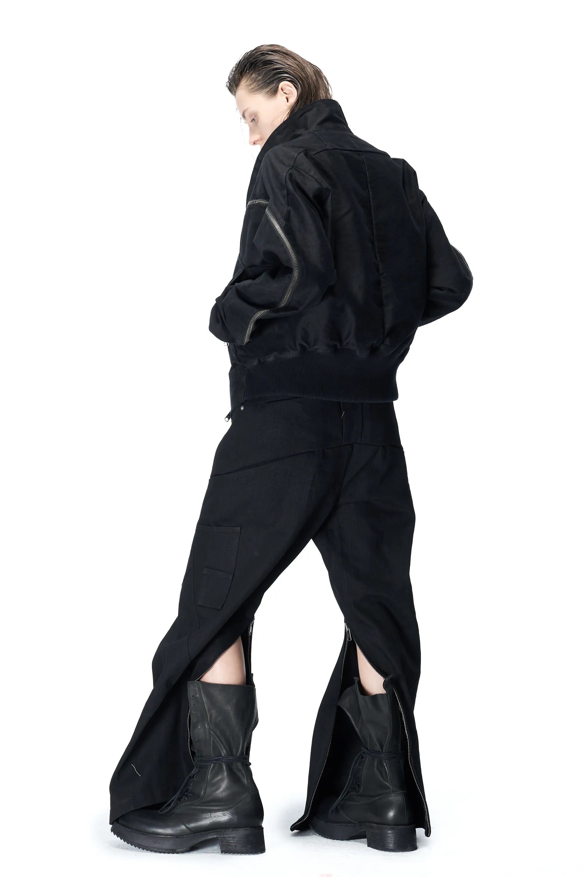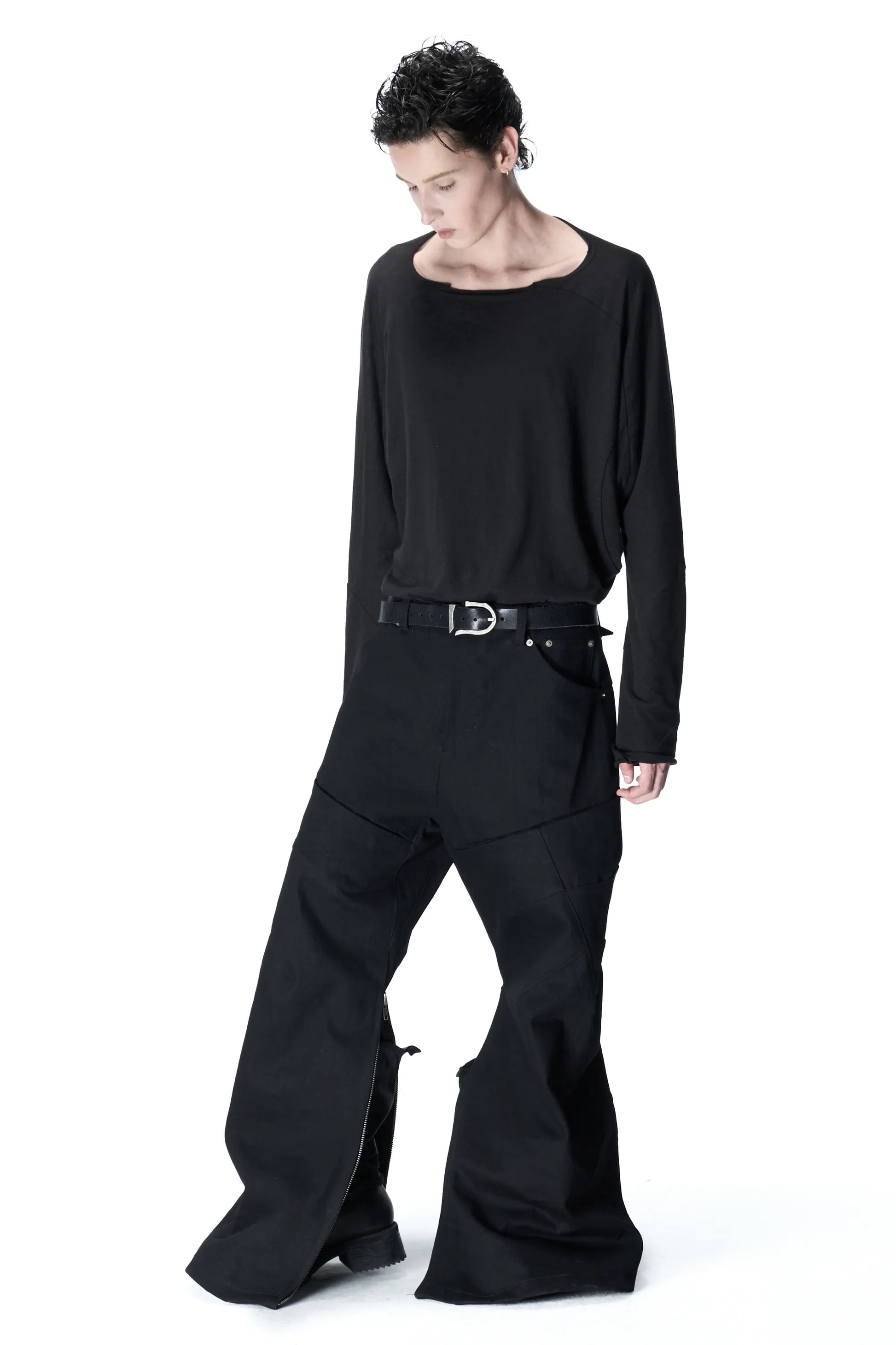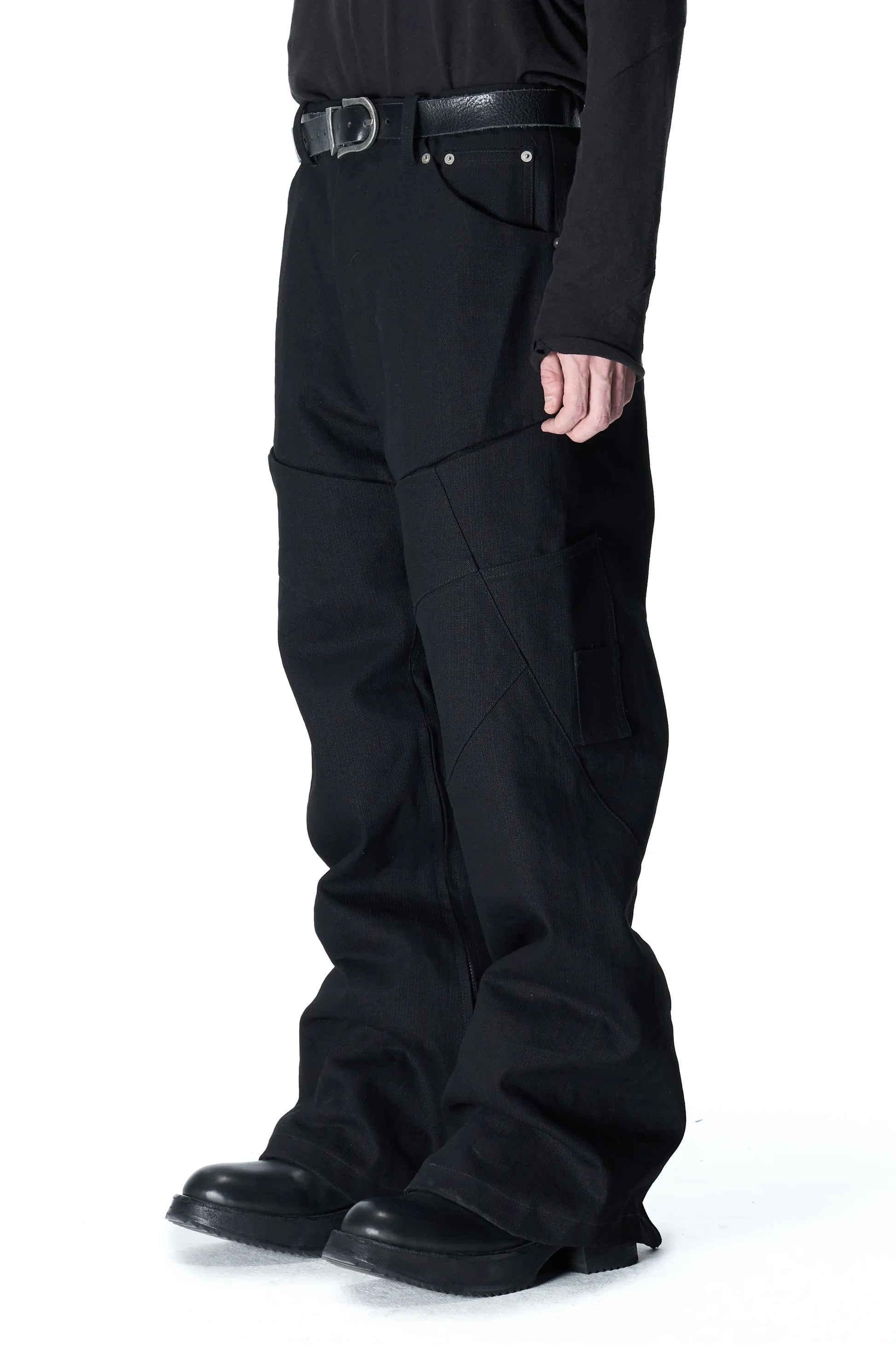 No outer side seams; offset inner side seams connecting to an openable zipper; extra crotch gusset for increased mobility; hidden pockets at thighs; watch pocket design from early denim styles; waistband-less design with bartacks replacing stitching to fix the placket; back hem cut with a natural arc to prevent stepping on the hem.