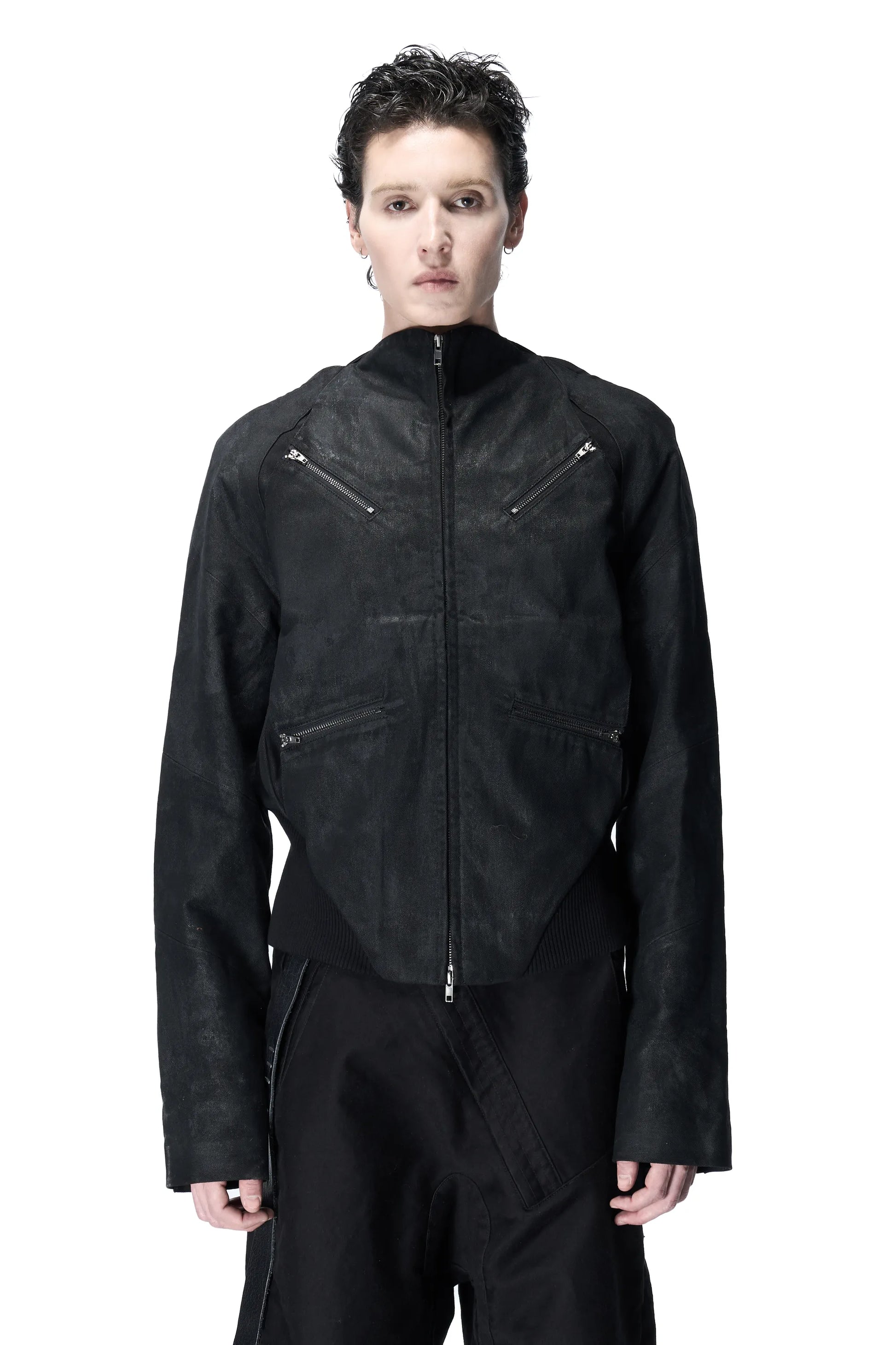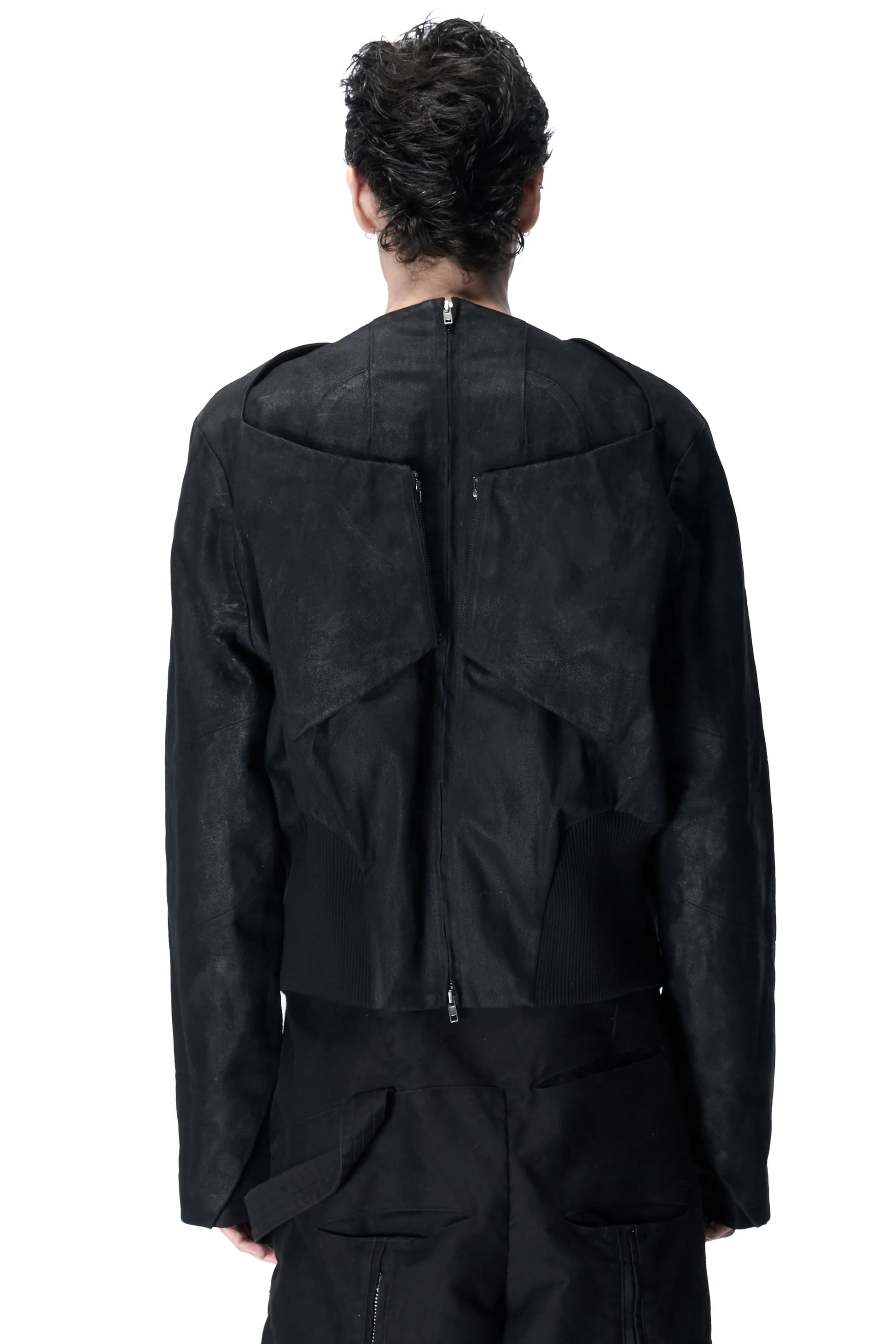 Wearable front-to-back; two-way zipper offers more styling possibilities; four T-Pockets (double-layer T-shaped pockets) on the chest; unique shaped hem ribbing with detached rib construction; unconventional shoulder and sleeve construction with suit sleeve vents; two Swathe Pockets (covered zipper pockets fixable to the body) on the back; offset side seams; hand-coated finish creating a mottled texture resembling concrete architecture.